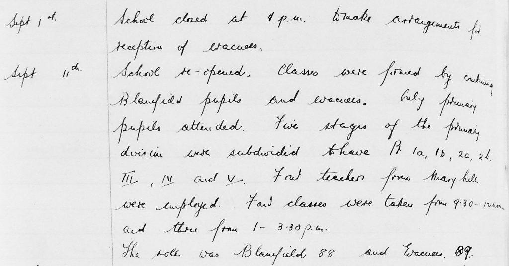 The start of the Second World War saw huge changes at the school. In September 1939 the school was closed for a time while hasty arrangements were made for the arrival of 89 evacuees and their teachers.